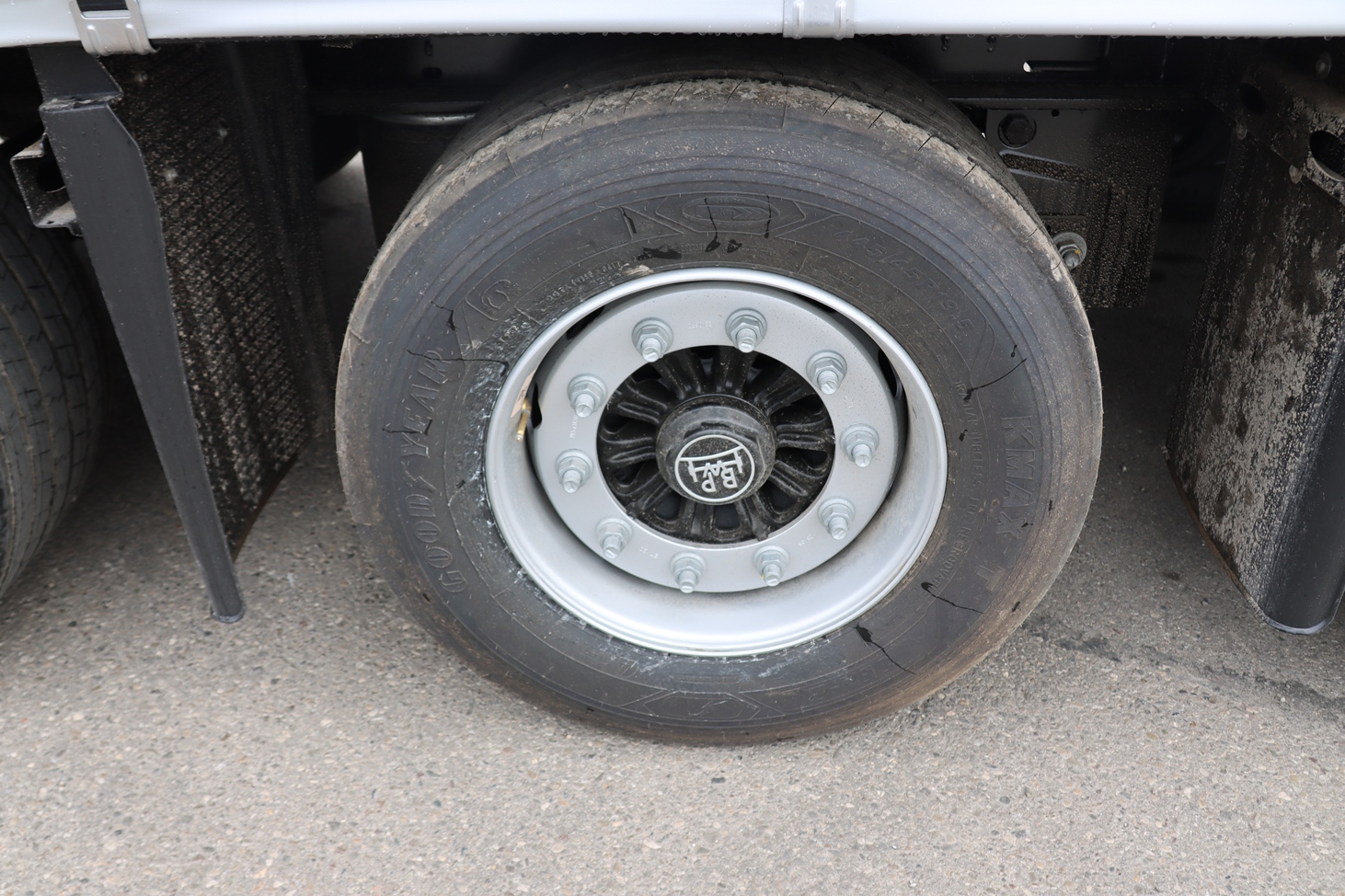 SISTEM DE RULARE 3 axe BPW ECO Air, cu frână pe disc Ø370 mm. Prima axă liftantă, complet automată, în funcție de sarcină, cu funcție de asistență la pornire. Sistem EBS Wabco. Suspensie pneumatică, inclusiv supapă de ridicare/coborâre. 6 anvelope 445/45 R19,5 GOODYEAR KMAX GEN2 T M+S TL 160J, jante de oțel ET120. Roată de rezervă completă.