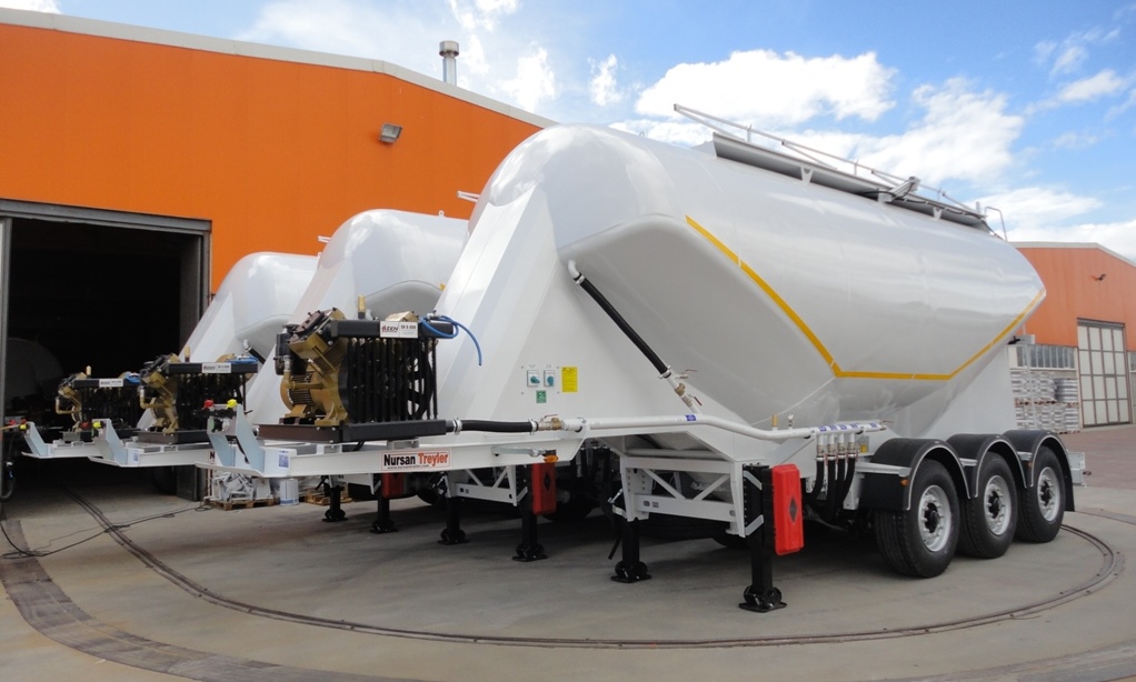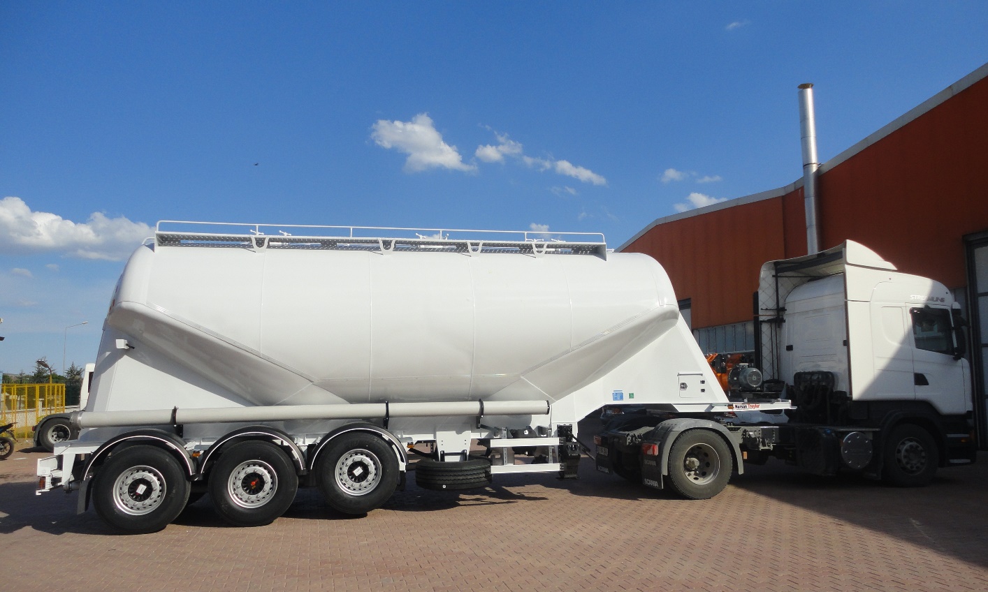 Bazin: vas sub presiune, realizat din aluminiu, avand capacitate de la 25 mc pana la 40 mc, cu 2 sau 3 trape de incarcare superioara, cu 2 sau 3 cunuri de descarcare, conducta descarcare la spatele bazinului sau pe partea laterala, linie de aer cu conectare la compresor extern, posibilitate montaj compresor diesel (in consola fata a semiremorcii), supape de siguranta, injectoare aer la conurile de descarcare, platforma de lucru la partea superioara cu bara de sprijin si scara de acces, etc.